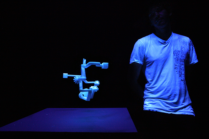 long, ABS blanc), en suspension au-dessus de socles sous lumière